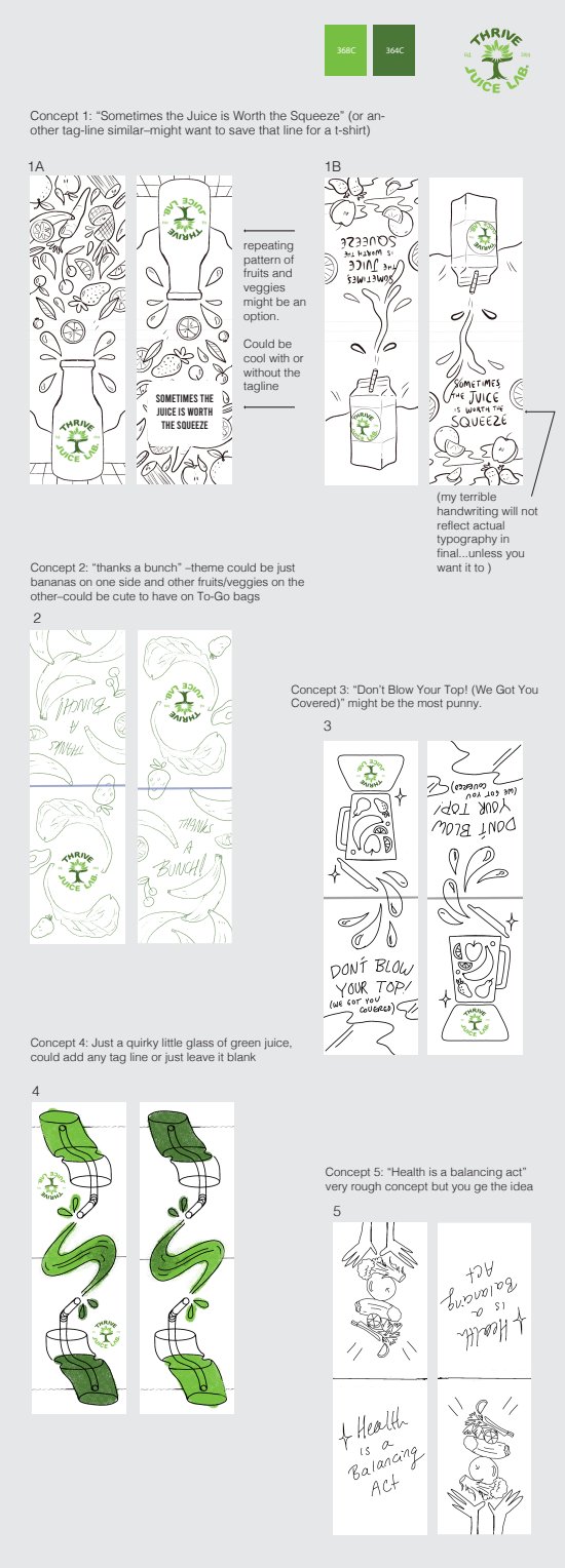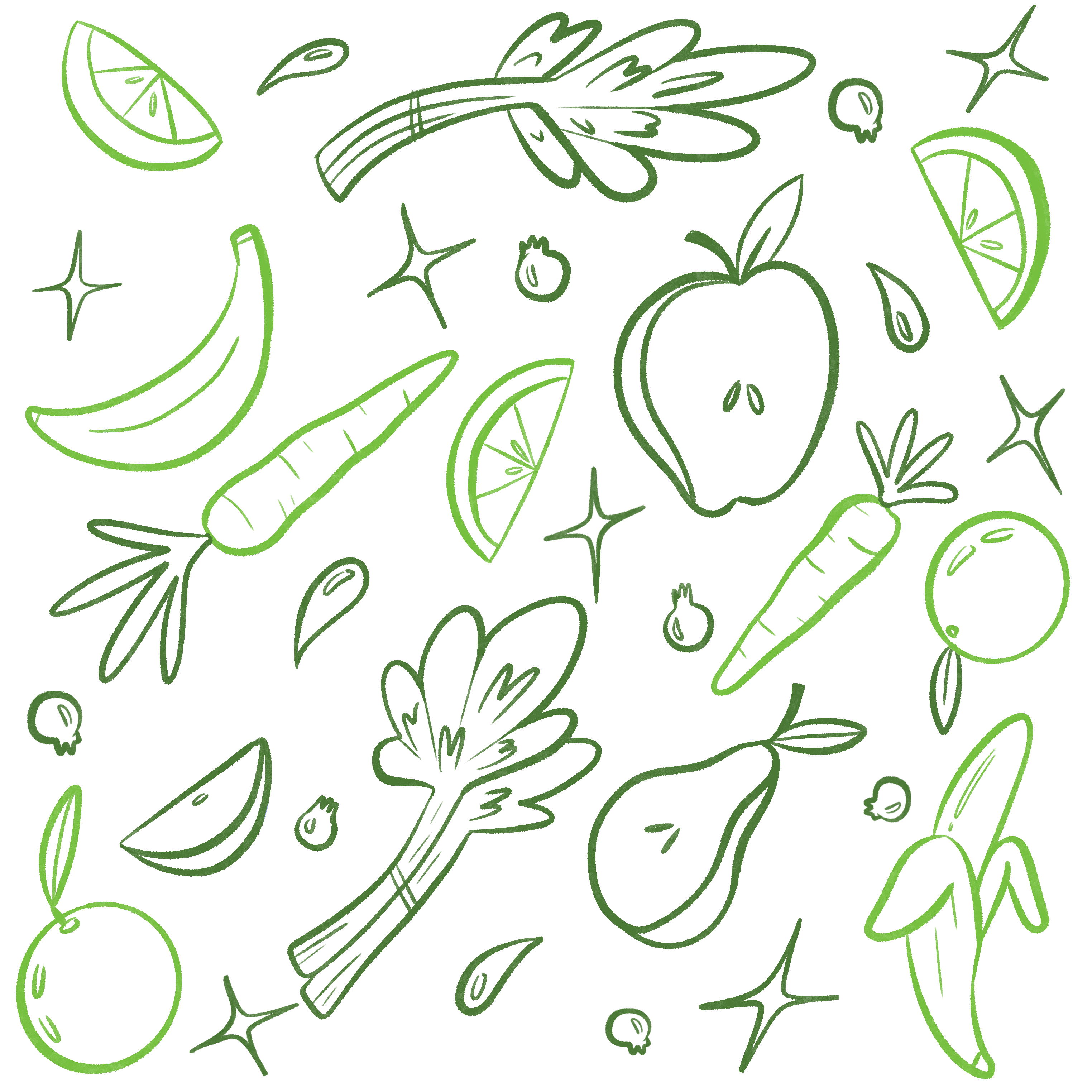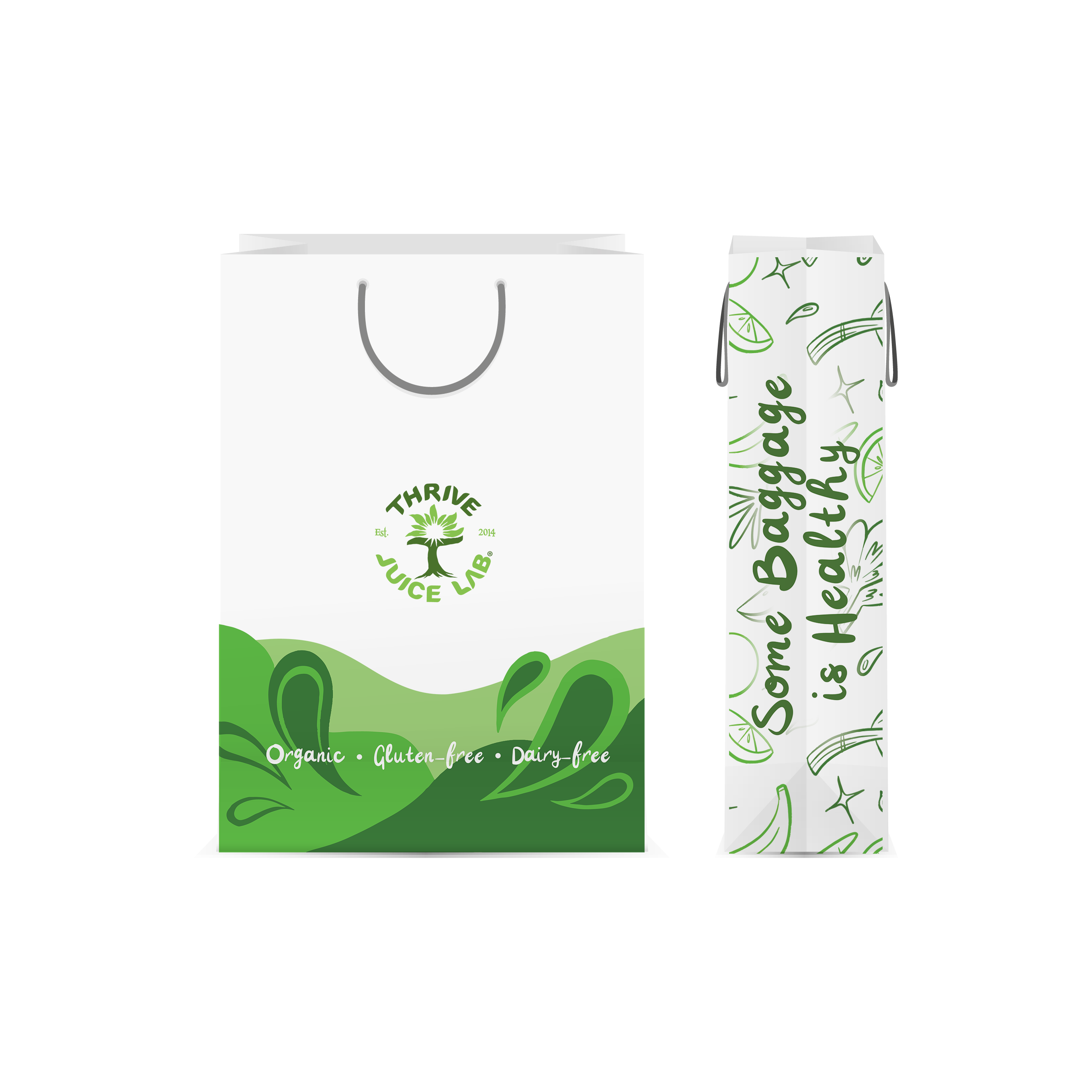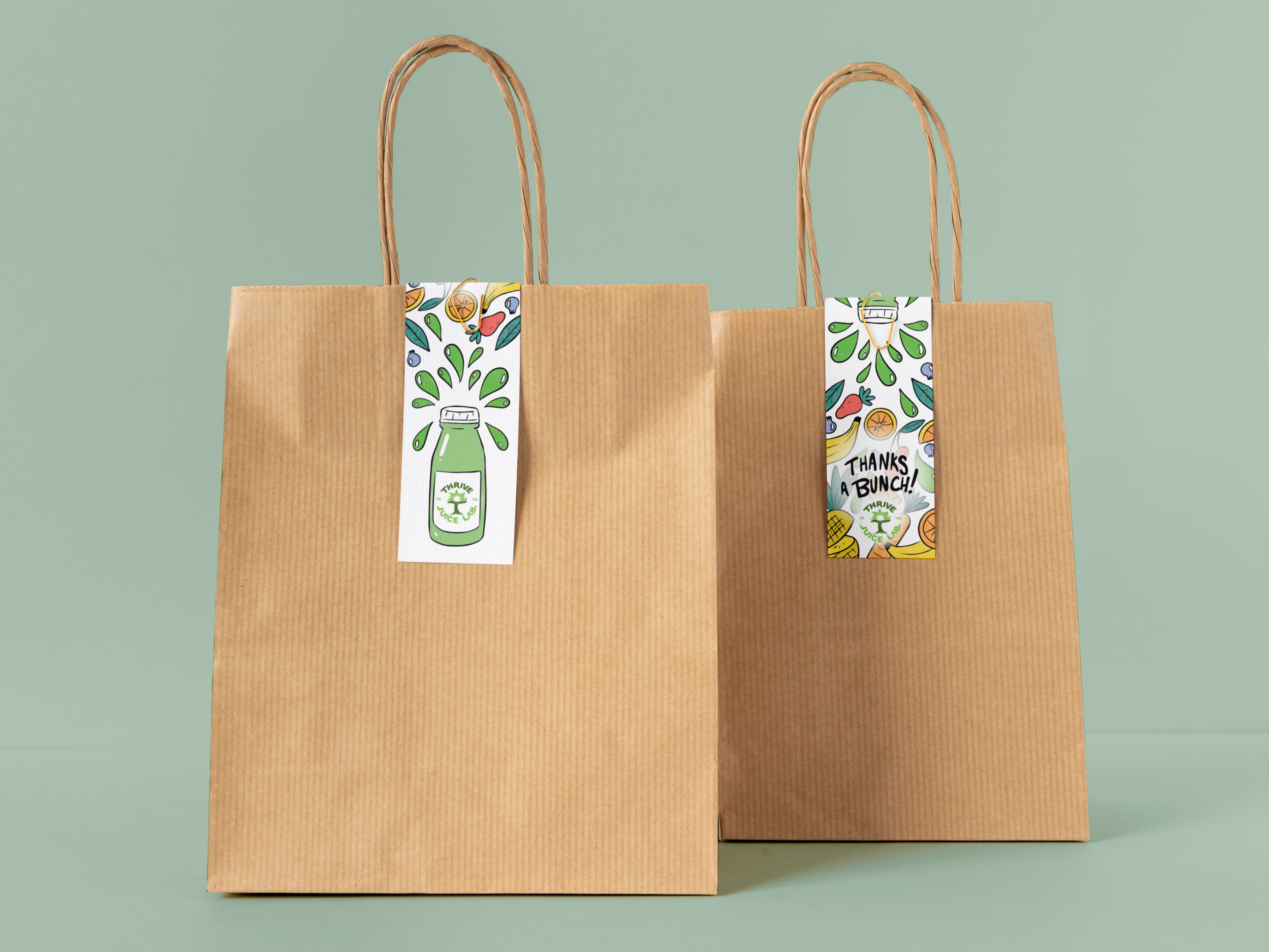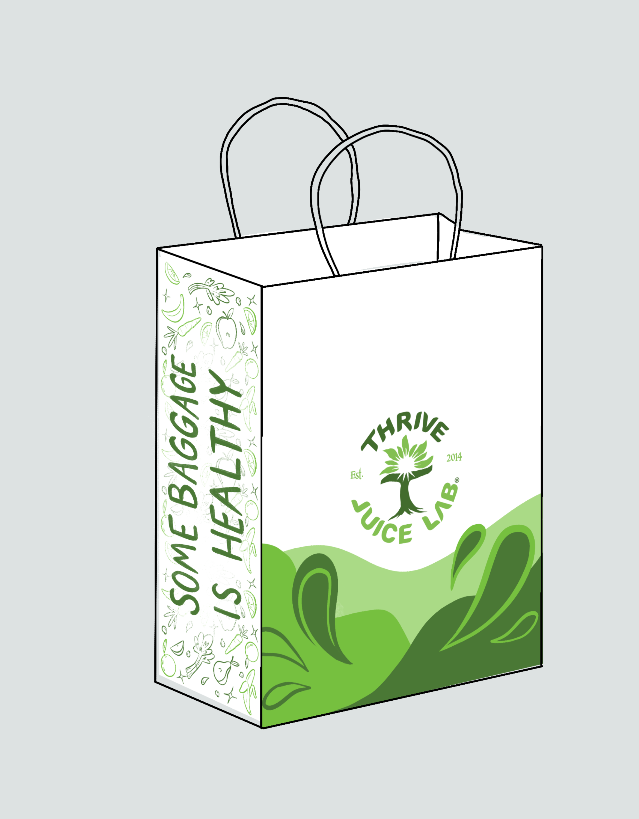 While this initially felt a bit like working in reverse, it ended up being a nice challenge. I decided to make a similar repeating pattern that echoed the jumble of fruit and vegetables from the sticker design, and a similar green juice splash at the bottom. The typography was customized to look more hand-drawn and playful, and the more rigid existing logo balanced out the overall feel of the bag design.